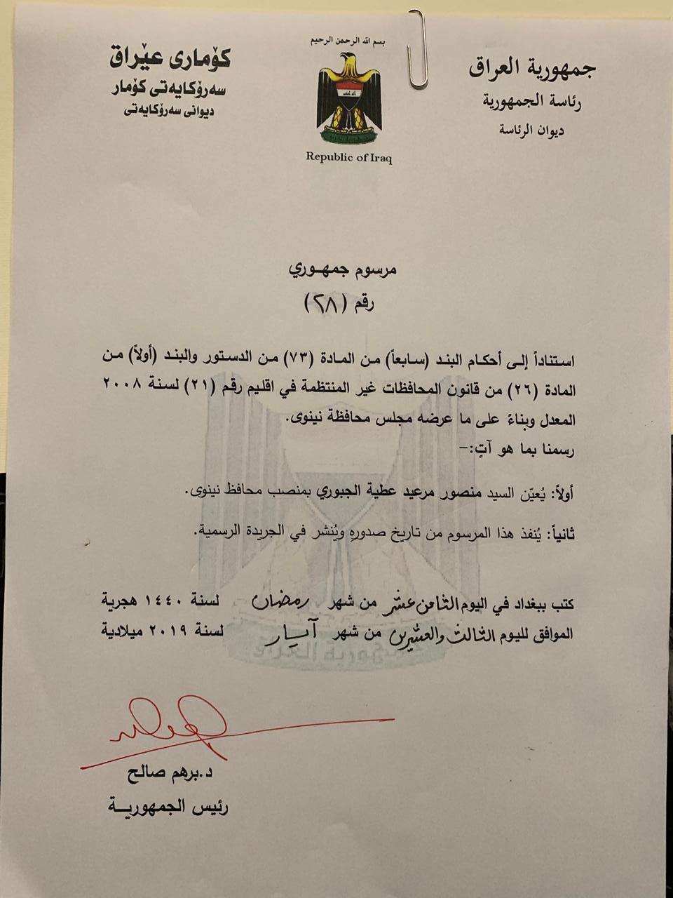 وبحسب المرسوم الجمهوري رقم 28 والذي صدر اليوم الخميس، 23 ايار 2019، نص على تعيين منصور مرعيد عطية الجبوري بمنصب محافظ نينوى على أن ينفذ المرسوم من تاريخ نشره بالجريدة الرسمية.