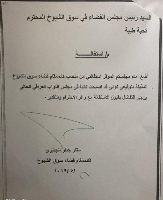 وطبقا لطلب الاستقالة، فإن "الجابري قدم طلب استقالته الى رئيس مجلس قضاء سوق الشيوخ"، مبررًا ذلك بـ"فوزه بعضوية البرلمان العراقي".