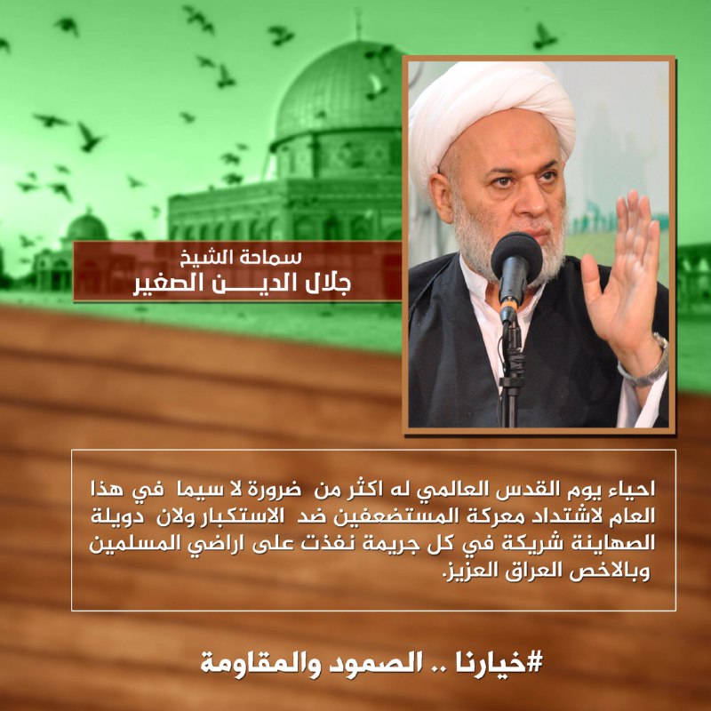 واضاف سماحته ان احياء يوم القدس العالمي له اكثر من ضرورة لا سيما في هذا العام لاشتداد معركة المستضعفين ضد الاستكبار ولان دويلة الصهاينة شريكة في كل جريمة نفذت على اراضي المسلمين وبالاخص العراق العزيز.