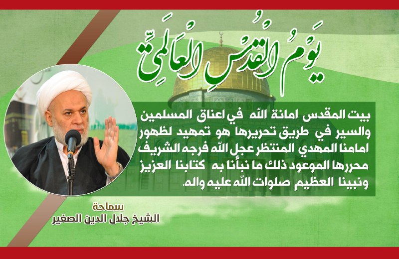 قال امام جامع براثا سماحة الشيخ جلال الدين الصغير في تغريدة له على تويتر ان بيت المقدس امانة الله في اعناق المسلمين والسير في طريق تحريره هو تمهيد لظهور امامنا المهدي المنتظر عجل الله فرجه الشريف محررها الموعود ذلك ما نبأنا به كتابنا العزيز ونبينا العظيم صلوات الله عليه واله.