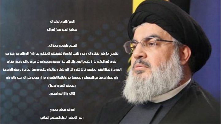 وجه الشيخ همام حمودي، رئيس المجلس الأعلى الاسلامي، اليوم الخميس، رسالة عزاء لسماحة السيد حسن نصر الله، امين عام حزب الله اللبناني، بوفاة شقيقته، فيما يلي نصها: