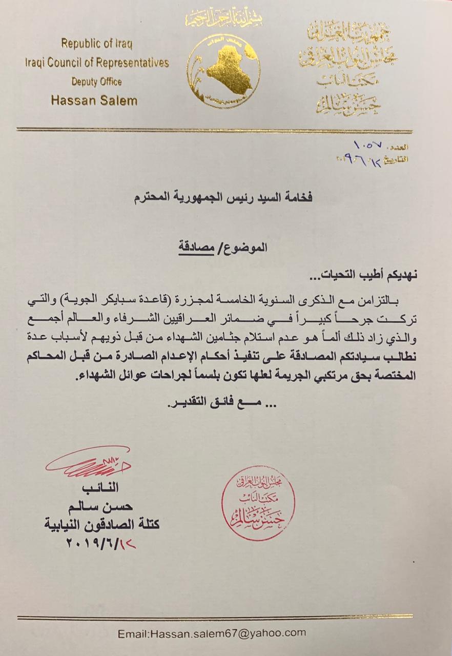 طالب النائب حسن سالم، السبت، رئيس الجمهوريةى برهم صالح بالمصادقة على اعدام مرتكبي مجزرة سبايكر.