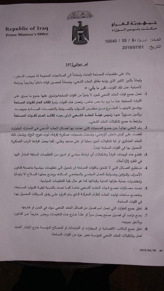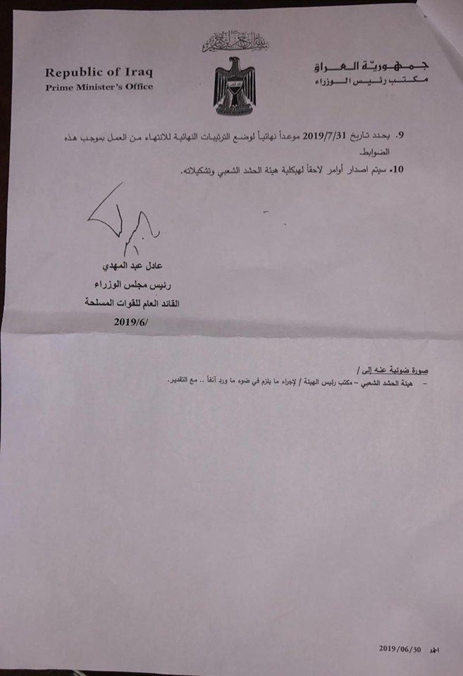 وجاء في الأمر الديواني الذي يتضمن عشرة نقاط، تأكيد عبد المهدي على "ضرورة إنهاء المظاهر المسلحة وارتباط الحشد رسمياً بالقائد العام للقوات المسلحة وإنهاء جميع التسميات التي كانت تستعمل خلال فترة الحرب على داعش، واستبدالها بـتسميات عسكرية ( فرقة، لواء، فوج..الخ)".
