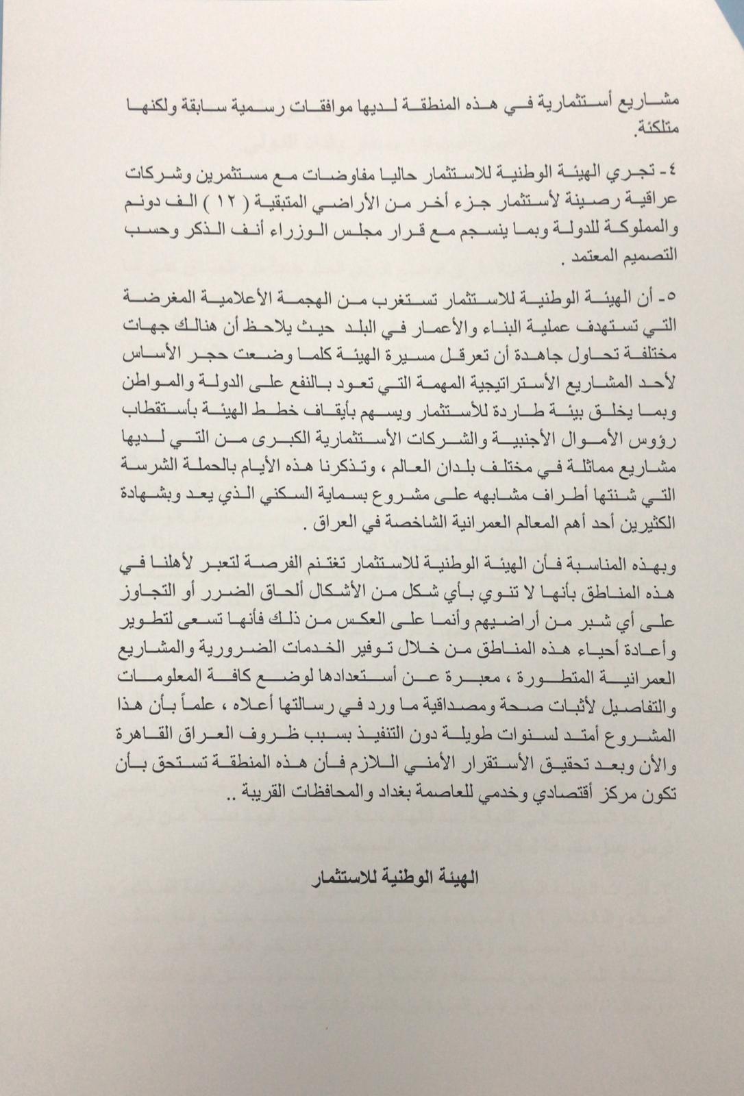 وذكرت الهيئة في بيان ان "قرار مجلس الوزراء على استثمار جزء من الأراضي المحيطة بمطار بغداد الدولي والبالغة مساحتها 16 ألف دونم، من أصل 106 ألف دونم متروكة وعائدة إلى الدولة، دون المساس بأية حقوق لأراضي خاصة وعائدة ومشغولة من قبل المواطنين".