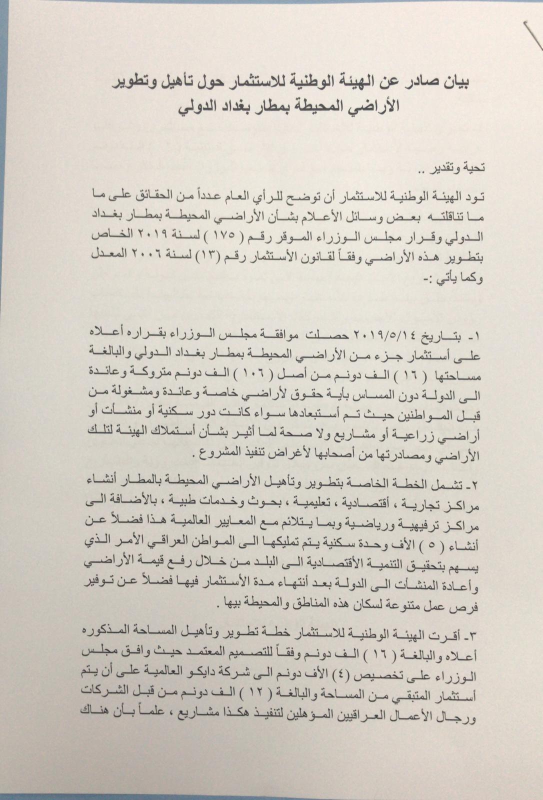 أصدرت هيئة الاستثمار، الثلاثاء، بياناً بشأن تأهيل الأراضي المحيطة بمطار بغداد.