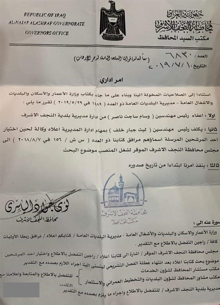 وتم نشر وثيقة صادرة من مكتب الياسري تضمنت أمراً إدارياً بإعفاء وسام ساجت ناصر من إدارة مديرية بلدية النجف، وتعيين ليث جبار بدلاً عنه، بالوكالة.