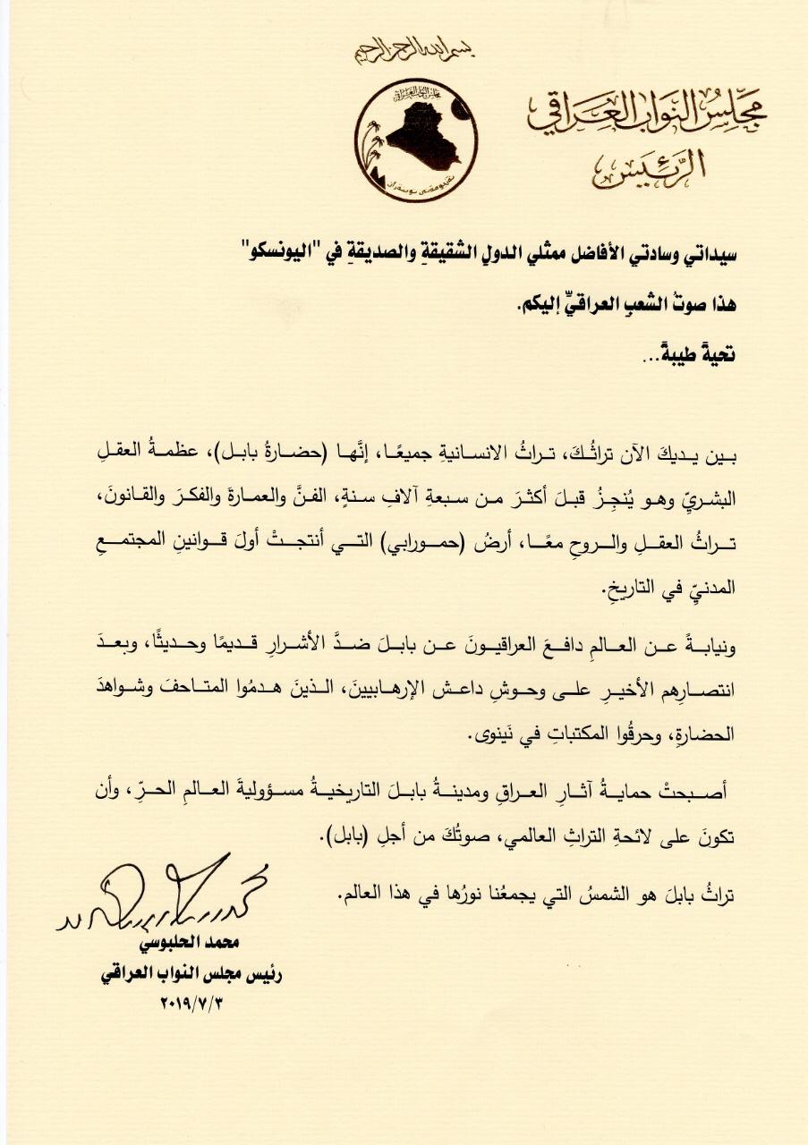 وجه رئيس مجلس النواب محمد الحلبوسي، اليوم الخميس، رسالةً إلى رؤساء الوفود العربية والأجنبية المجتمعين في مؤتمر لجنة التراث العالمي بدورتها الثالثة والأربعين، الذي تنظمه منظمة الأمم المتحدة للتربية والعلوم والثقافة (اليونسكو) في العاصمة الأذربيجانية باكو، إذ يسعى العراق بجهد حكومي وبرلماني إلى وضع مدينة بابل التاريخية ضمن لائحة التراث العالمي.