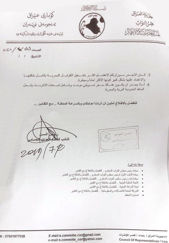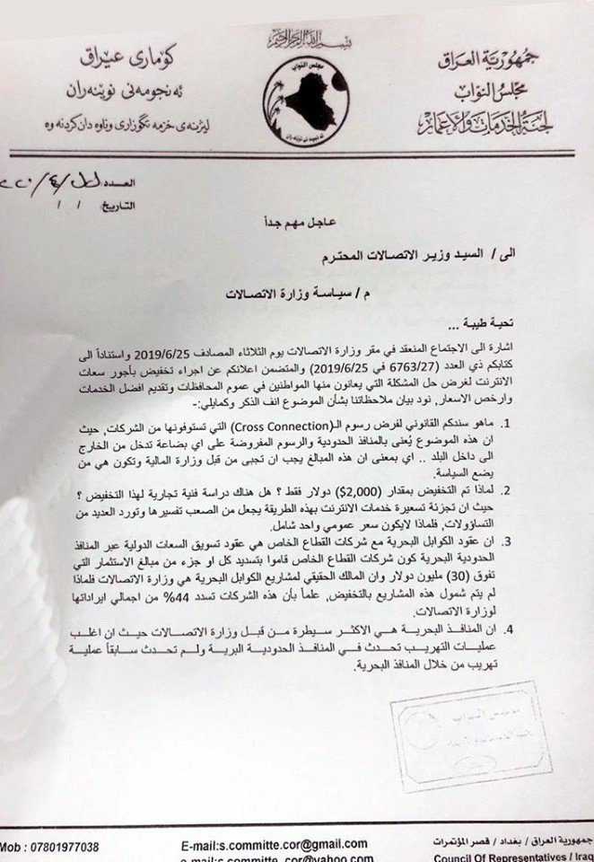 نشرت وثيقة تتضمن ستة اسئلة مقدمة من لجنة الخدمات النيابية الى وزير الاتصالات نعيم تجيل، فيما بينت الوثيقة أن فحوى الاسئلة يدور حول أسعار سعات الانترنت.