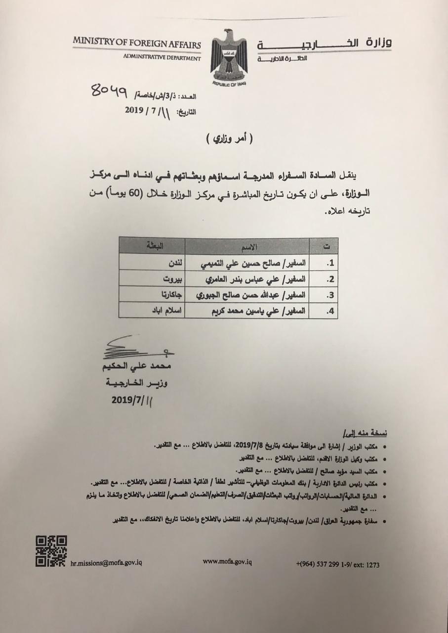 والقرار تضمن نقل السفير صالح التميمي في لندن والسفير علي العامري في بيروت والسفير عبد الله الجبوري في جاكارتا والسفير علي ياسين في اسلام اباد، الى العاصمة بغداد.