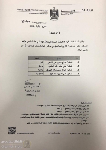 والقرار تضمن نقل السفير صالح التميمي في لندن والسفير علي العامري في بيروت والسفير عبد الله الجبوري في جاكارتا والسفير علي ياسين في اسلام اباد، الى العاصمة بغداد.