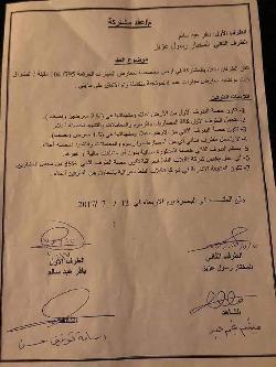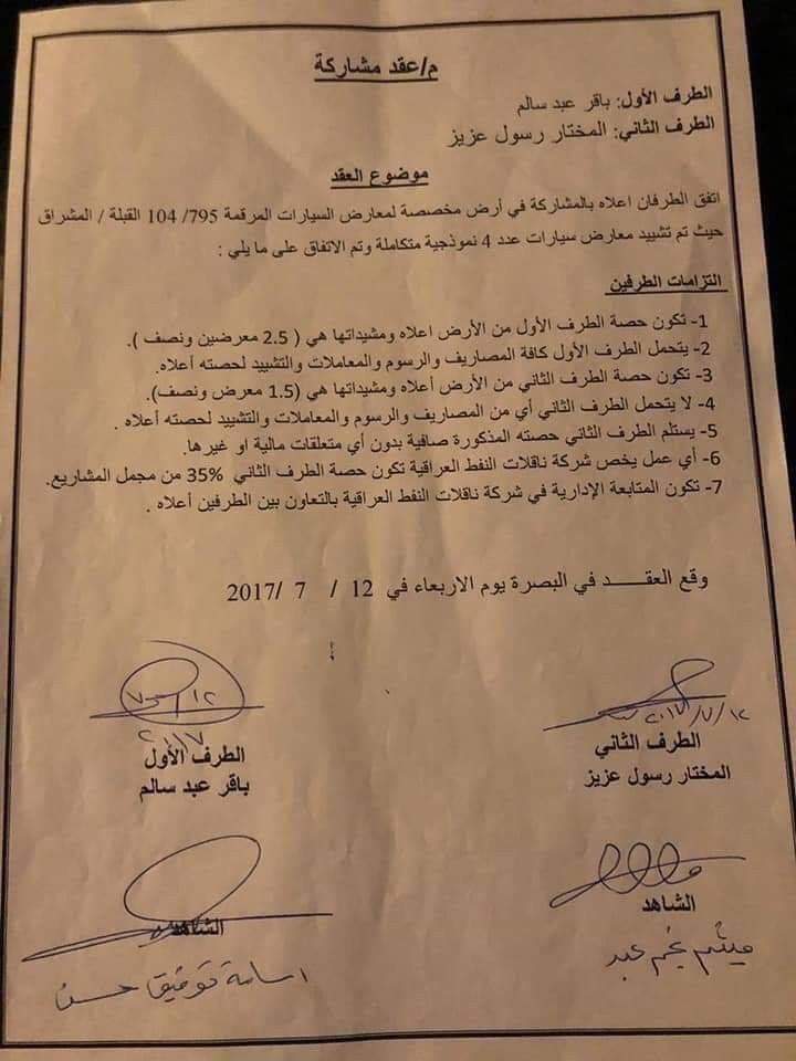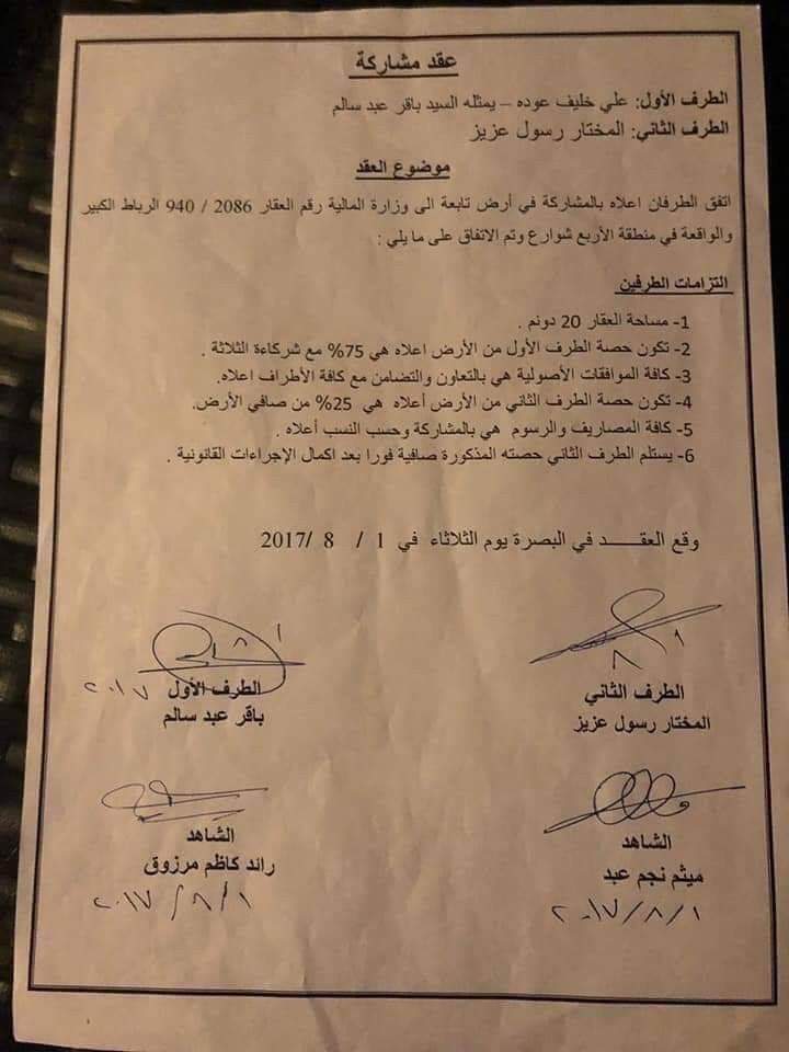 سيد باقر المرياني والمخول الثاني ممثل اللجنة الاقتصادية ابو إسحاق ، علئ ان يكون حصة الطرف الاول معرضين ونصف والطرف الثاني معرض ونصف .. وتفاصيل العقد سوف ترفق لاحقاً..