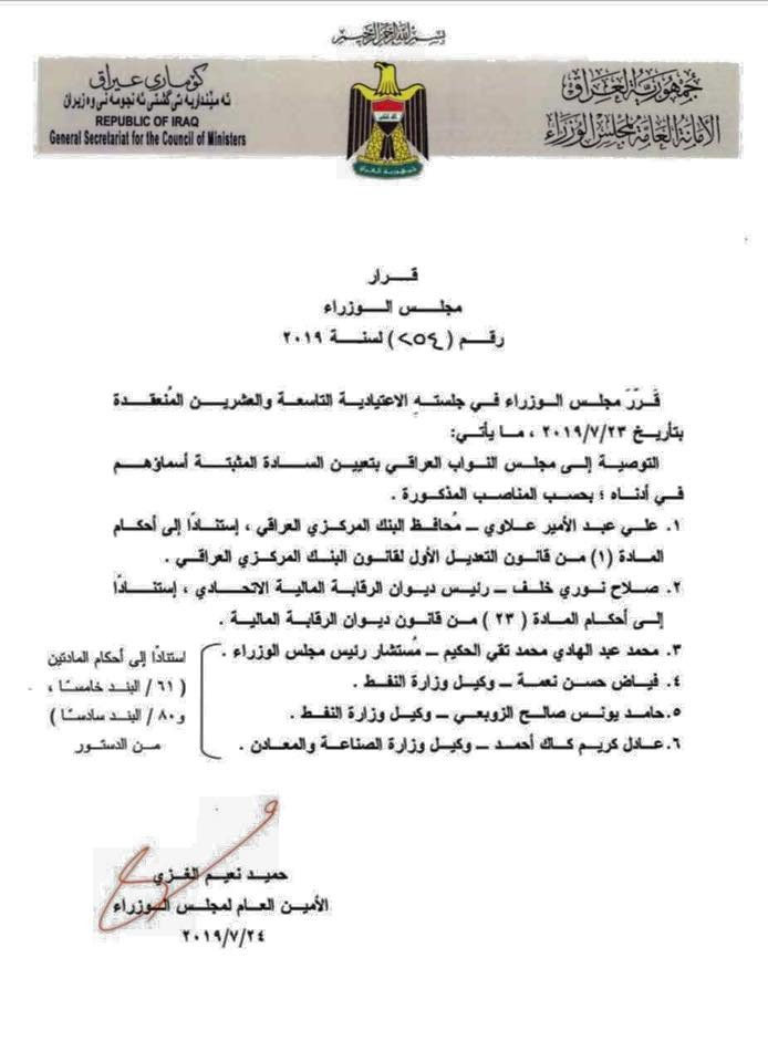 وبحسب وثيقة للأمانة العامة لمجلس الوزراء فان المجلس "قرر التوصية الى مجلس النواب بتعيين {علي عبد الأمير علاوي} محافظاً للبنك المركزي، إستناداً الى أحكام المادة 1 من قانون التعديل الأول لقانون البنك المركزي العراقي.