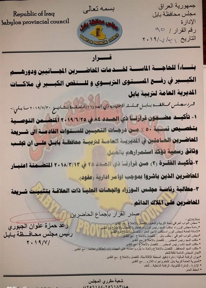 وجاءت في الوثيقة الصادرة من المجلس بتاريخ 31/7/ 2019، انه "بناء للحاجة الماسة لخدمات المحاضرين المجانيين ودورهم الكبير في رفع المستوى التربوي والنقص الحاصل في ملاكات تربية محافظة بابل"،