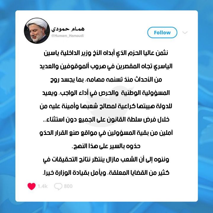 وقال الشيخ حمودي، في تغريدة على تويتر، "نثمن عاليا الحزم الذي أبداه الأخ وزير الداخلية ياسين الياسري تجاه المقصرين في هروب ألموقوفين والعديد من الأحداث منذ تسنمه مهامه، بما يجسد روح المسؤولية الوطنية والحرص في أداء الواجب، ويعيد للدولة هيبتها كراعية لمصالح شعبها وأمينة عليه من خلال فرض سلطة القانون على الجميع دون استثناء.. آملين من بقية المسؤولين في مواقع صنع القرار الحذو حذوه بالسير على هذا النهج".