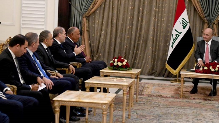 وقال المكتب الاعلامي لرئاسة الجمهورية في بيان إن "رئيس الجمهورية استقبل اليوم في قصر السلام ببغداد، وزيري خارجية مصر سامح شكري، والأردن أيمن الصفدي، واكد ان العراق يعطي أولوية لعلاقاته مع أشقائه وفقاً لسياسة الانفتاح على محيطه العربي وعمقه الإسلامي التي نحرص على ترسيخها من خلال تبادل الأفكار والرؤى بشأن القضايا والأحداث الراهنة"، مشيراً إلى "أهمية تطوير أسس العمل العربي المشترك لتحقيق الرفاهية والازدهار الاقتصادي لشعوبنا".