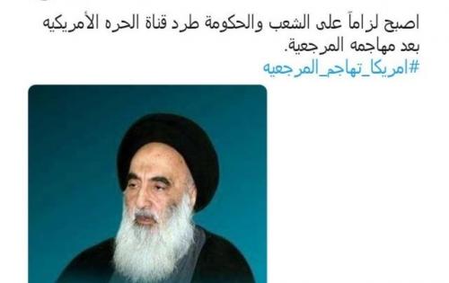 تصدر هاشتاغ "امريكا تهاجم المرجعية" موقع التواصل الاجتماعي "تويتر" حيث عبر الناشطون عن استنكارهم لتقرير "قناة الحرة"، مؤكدين ان، امريكا تهاجم المرجعية لانها وقفت بوجه مشروعها التقسيمي للعراق.