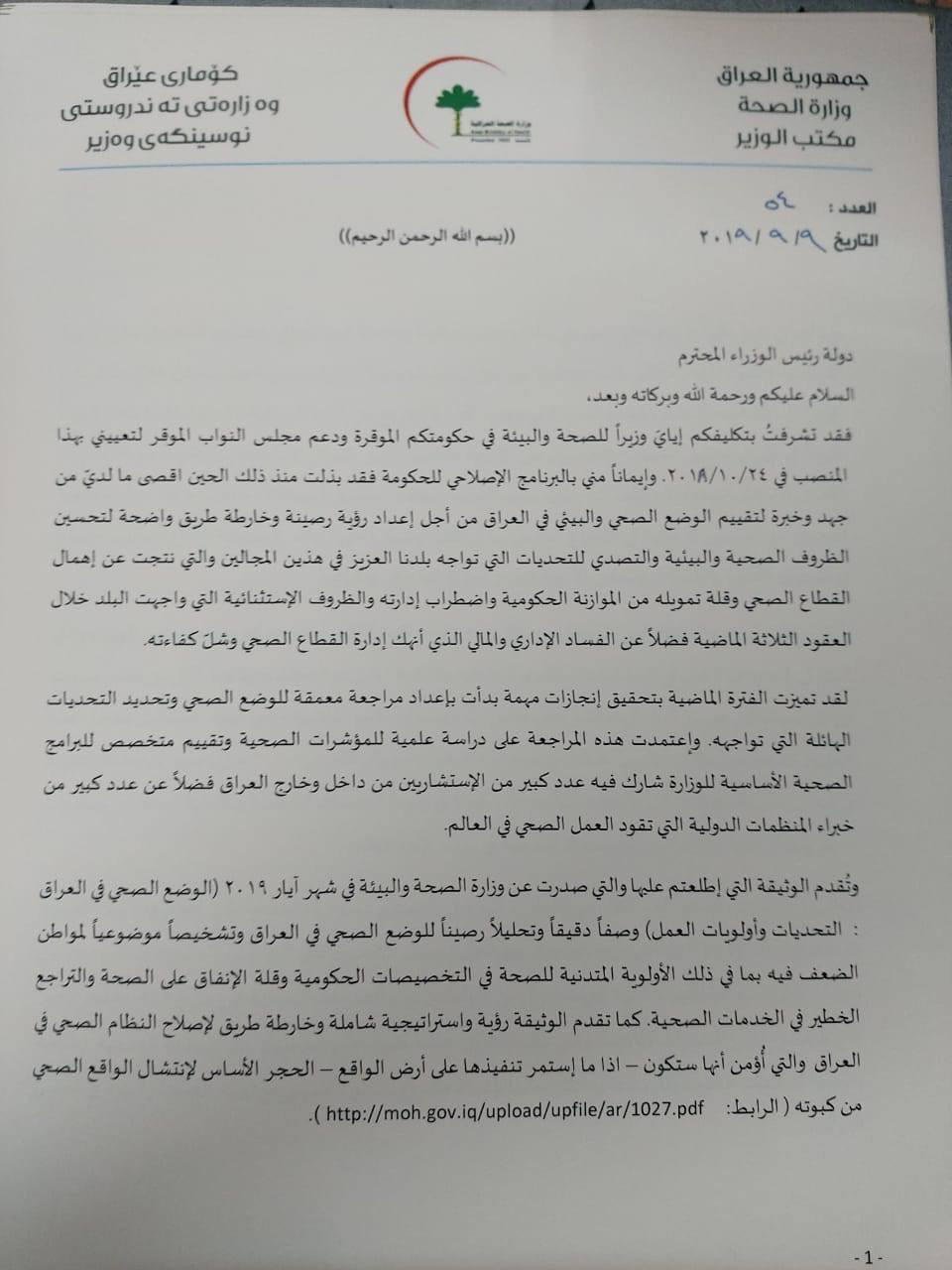 ص استقالة وزير الصحة علاء الدين العلوان التي قدمها الى رئيس الوزراء عادل عبد المهدي.