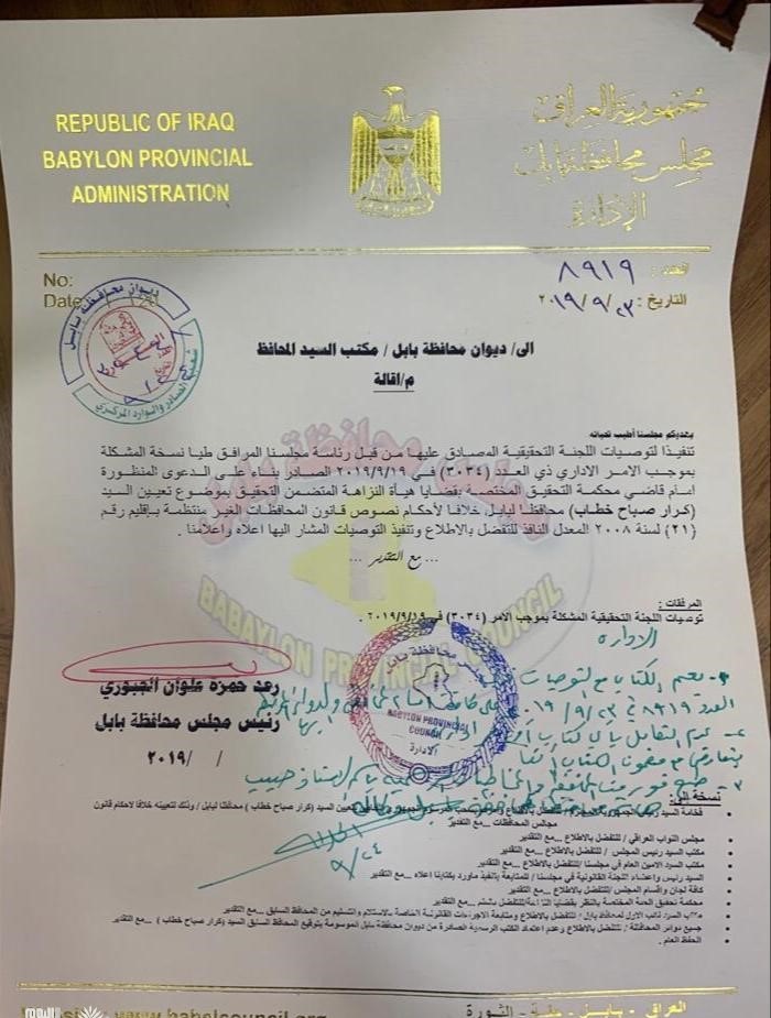 وتم نشر وثيقة تضمنت اقالة المحافظ كرار العبادي من منصبه.