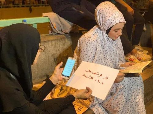 حيث انتشرت هذه الصورة لأحدى المتظاهرات في ساحة التحرير وسط بغداد وهي ترتل القران الكريم على ارواح الشهداء في الوقت الذي كانت تعلوا فيه اصوات الغناء والطرب متناسية ما يمر به البلاد من احداث راح ضحيتها كوكبة من الشهداء.