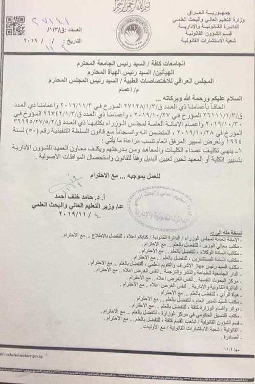 واضافت "يكلف معاون العميد للشؤون الإدارية بتسيير الكلية أو المعهد، لحين تعيين البديل وفقاً للقانون واستحصال الموافقات الأصولية".