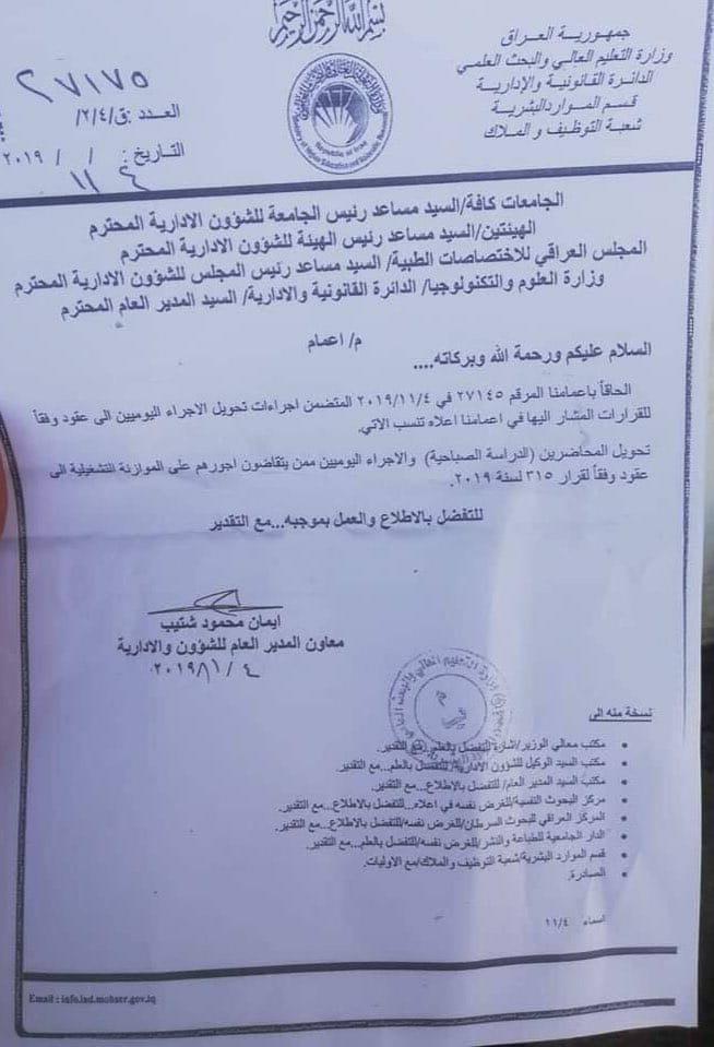 وذكر بيان صدر عن الوزارة ، أن “وزير التعليم العالي والبحث العلمي قصي السهيل قرر تحويل جميع المحاضرين ( الدراسة الصباحية ) وموظفين الاجراء اليوميين في جامعات ومؤسسات وزارة التعليم العالي وكذلك العلوم والتكنولوجيا المدمجة ممن يتقاضون اجورهم على الموازنة التشغيلية إلى عقود وفقا لقرار ٣١٥ لسنة ٢٠١٩”.