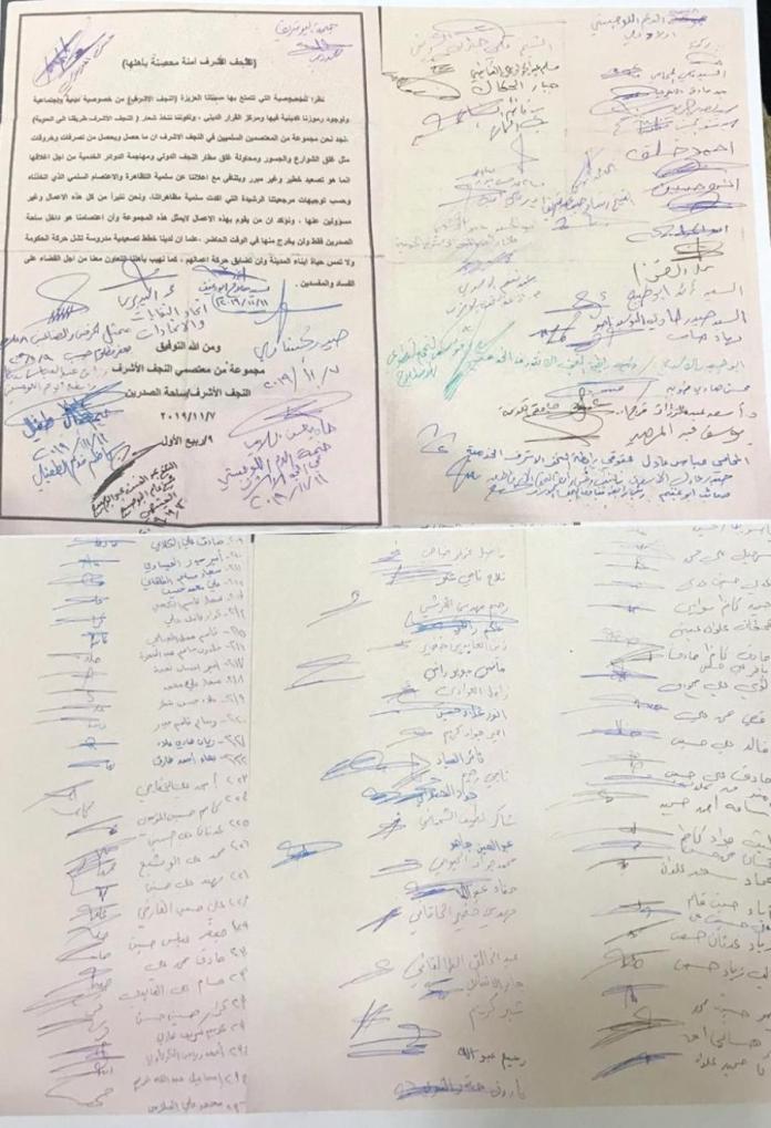 ونحن نفتخر إذ كانت ولا زالت وستبقى النجف ومتظاهريها نموذجا للتظاهر السلمي الراقي والتي لم تسجل فيها لا إصابات ولا شهداء ولا حوادث ولا تخريب للمؤوسسات او الاعتداء على المصالح الخاصة او الاحتكاك مع الأجهزة الأمنية الذين نعتبرهم آبائنا واخواننا، حيث كنا طيبت هذه الفترة حريصون أن نبقى بمستوى يليق بالنجف الاشرف وعليه وقعنا بالبراءة من كل منفلت ومخرب ونطلب من القوات الامنية التعامل معهم وفق القانون وسنبقى سلميين دائما وابدا”.