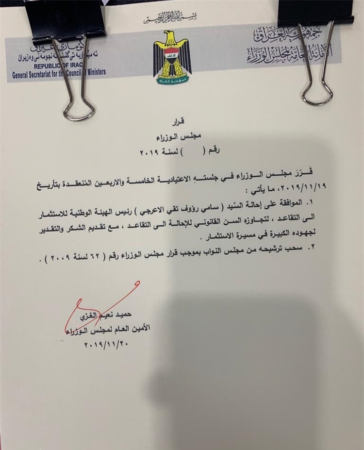 مجلس الوزراء يحيل رئيس هيأة الاستثمار إلى التقاعد ويسحب ترشيحه من البرلمان