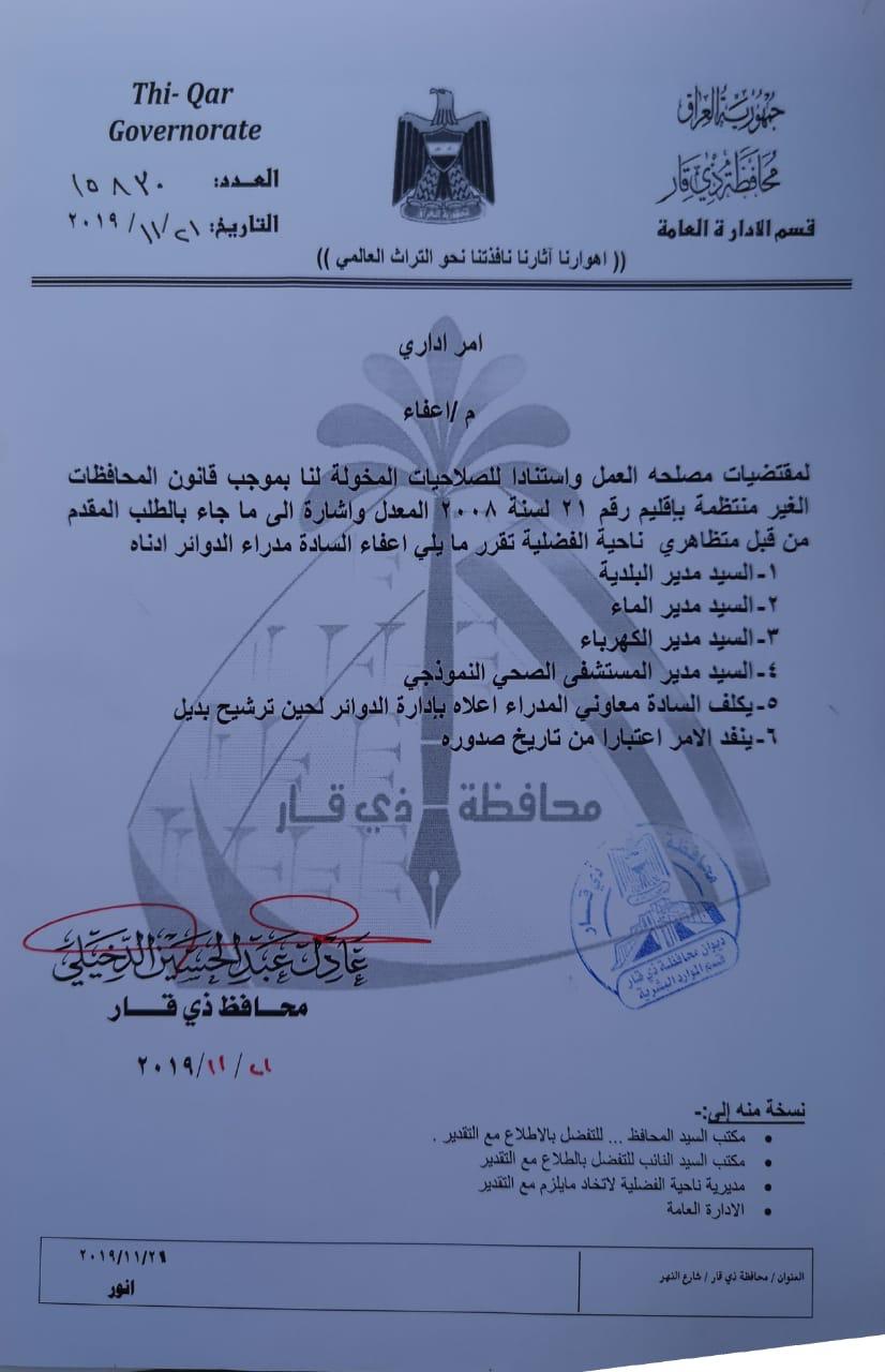 قرر محافظ ذي قار عادل الدخيلي، الجمعة، إعفاء مدراء أربع دوائر في ناحية الفضيلية تنفيذاً لمطالب المتظاهرين.