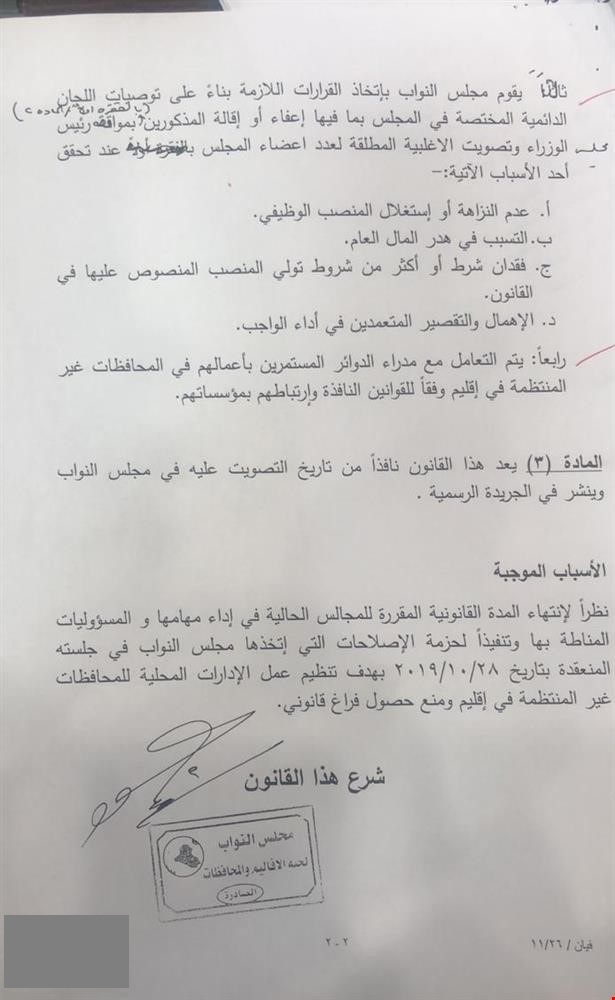 وتضمن التعديل، كما تظهر نسخ من وثائق تعديل الفقرة ثالثاً من المادة (44) من القانون، ليحل محلها: "انهاء عمل مجالس المحافظات غير المنتظمة في اقليم ومجالس الاقضية والنواحي التابعة لها".