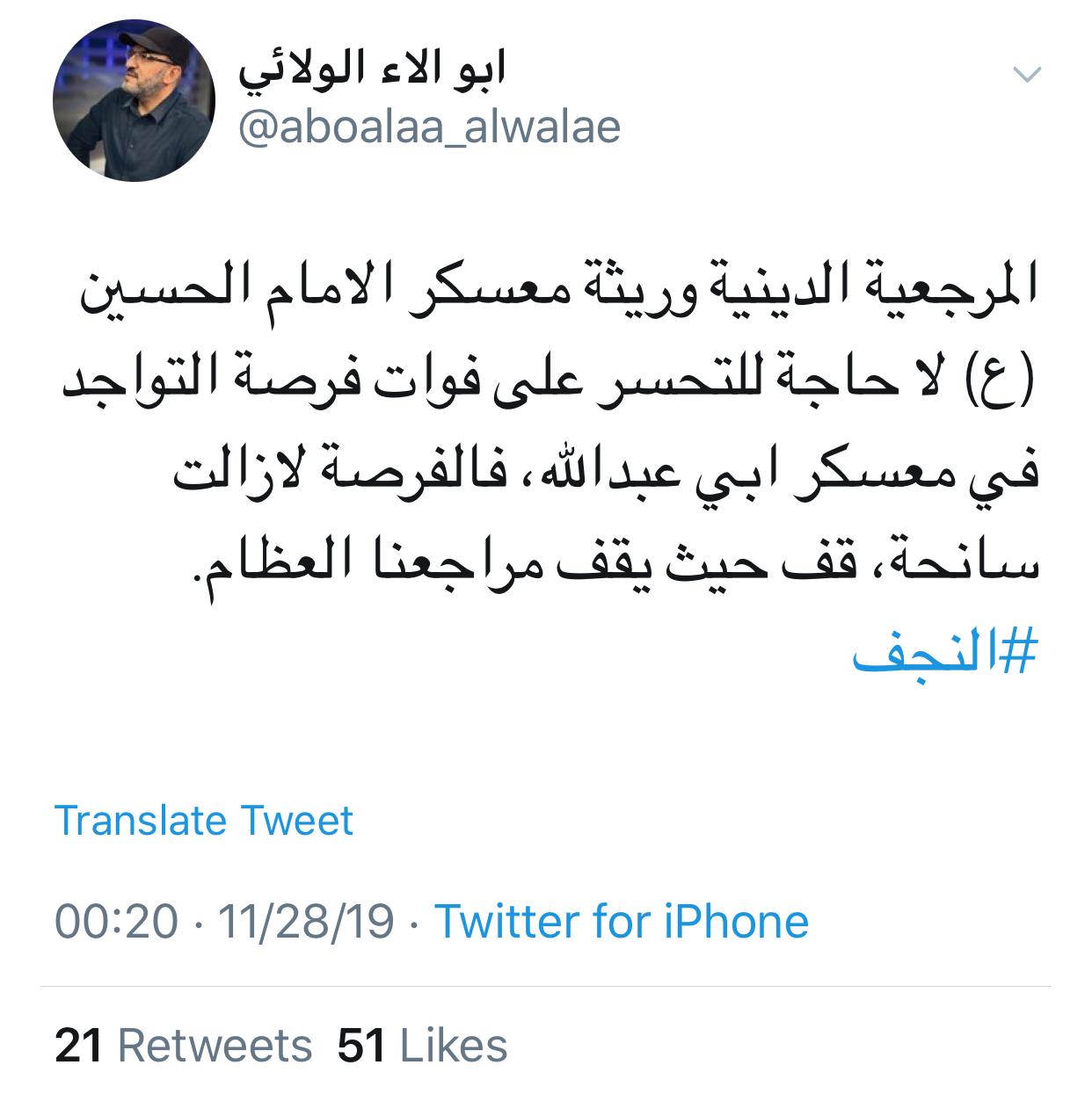 مضيفا الى انه لا حاجة للتحسر على فوات فرصة التواجد في معسكر ابي عبد الله فالفرصة لازالت سانحة , مختتما تغريدته قف حيث يقف مراجعنا العظام