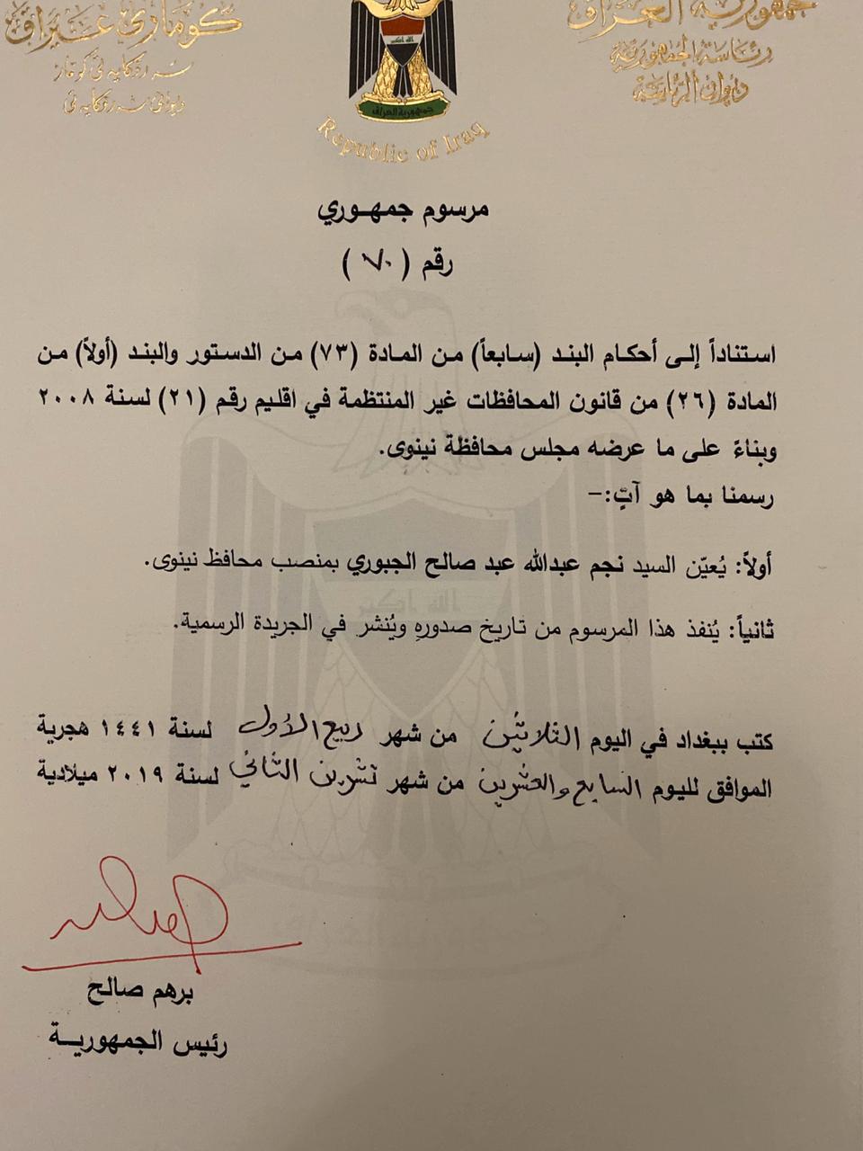 صادق رئيس الجمهورية برهم صالح على تعيين نجم الجبوري محافظاً لنينوى بحسب مرسوم جمهوري صدر اليوم