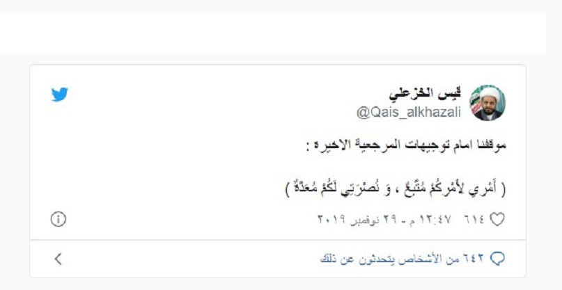 في تغريدة له ... الشيخ قيس الخزعلي يعلن موقفه من دعوة الامام المفدى السيد علي السيستاني