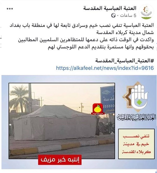 نفت العتبة العباسية المقدسة، الخميس (05 كانون الأول 2019)، دعوتها الى تظاهرة يوم الجمعة ٦/١٢/٢٠١٩، مؤكدة ان العتبة مشتركة فيها وليست داعية لها.