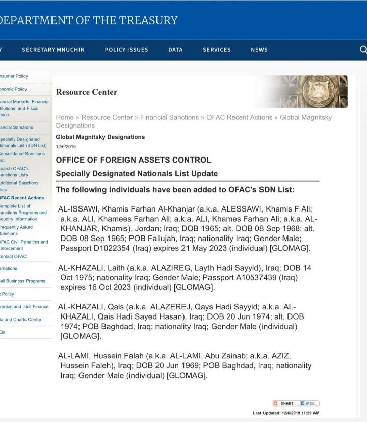 وذكر مصدر صحفي أن "الخزانة الأميركية تفرض عقوبات على 4 مسؤولين عراقيين لانتهاكهم حقوق الانسان والفساد