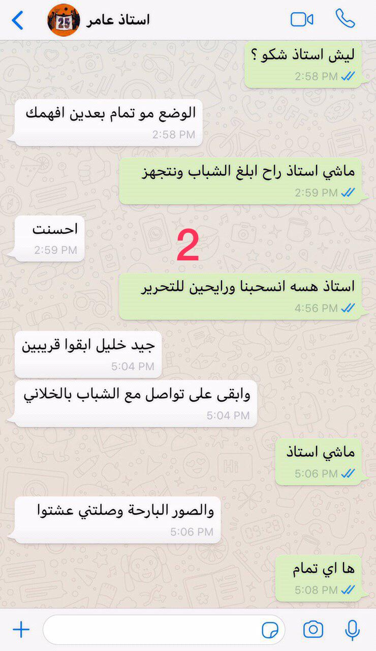 وتبين المحادثة ان المجرم عامر السعدون كان على علم مسبق باحداث السنك واستغل الاحداث ومجاميعه لقتل وتصفية الابرياء من الشباب المتواجد في تلك المنطقة