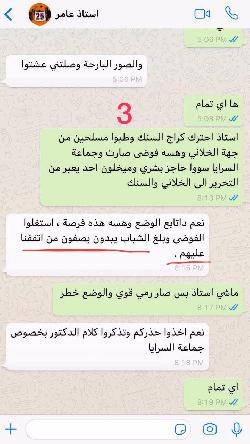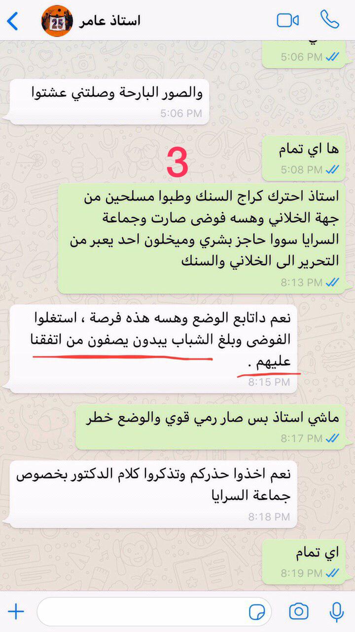 وتبين المحادثات بين احد المتواجدين في مراب السنك وهو مسؤول المجاميع الفوضوية والاجرامية في مراب السنك والمنطقة المحيطة وبين المدعو عامر عبد المجيد السعدون مسؤول التجمعات الفوضية والاجرامية المنتمية لحزب البعث الصدامي المقبور وهو نجل عبد المجيد السعدون القيادي في حزب البعث الكافر ويعيش في تركيا حاليا .