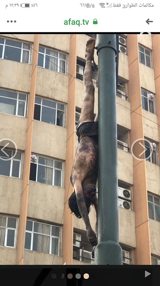 فجعنا اليوم بجريمة بشعة لا يمكن لاي انسان ان يقبلها , هذه الجريمة التي ارتكبها المتظاهرون الذين يدعون انهم سلميون بحق شاب عمره 17 عاما تشير بلا ادنى شك مدى الانحدار الذي يعانيه بعض افراد الشعب العراقي واخص بالذكر بعض المراهقين الذي تسممت عقولهم وافكارهم وتربت على القتل والهتك والانحلال الخلقي .