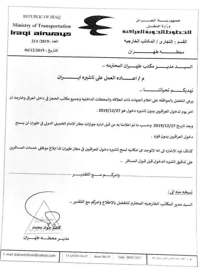وأظهرت وثيقة، موجهة من محطة طهران في المكاتب الخارجية للخطوط الجوية العراقية التابعة لوزارة النقل، إلى مدير مكتب طهران، إنه "بعد تاريخ 27/ 12/ 2019 لن يسمح دخول العراقيين بدون فيزا"