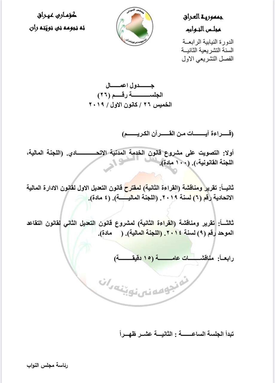 نشرت الدائرة الإعلامية لمجلس النواب، الأربعاء، جدول أعمال الجلسة رقم 26 والتي من المقرر عقدها غداً الخميس، ويتضمن الجدول التصويت على مشروع قانون الخدمة المدنية الاتحادي، بالإضافة إلى القراءة الثانية لمشروع قانون التعديل الثاني لقانون التقاعد الموحد.