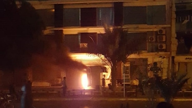 مشيرا الى ان المتظاهرين الذين يدعون انهم سلميين قاموا بحرق حرق عدد من المباني و الكرفانات في الشارع". منها مبنى يقع فيه مصرف التجاري العراقي .