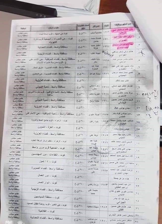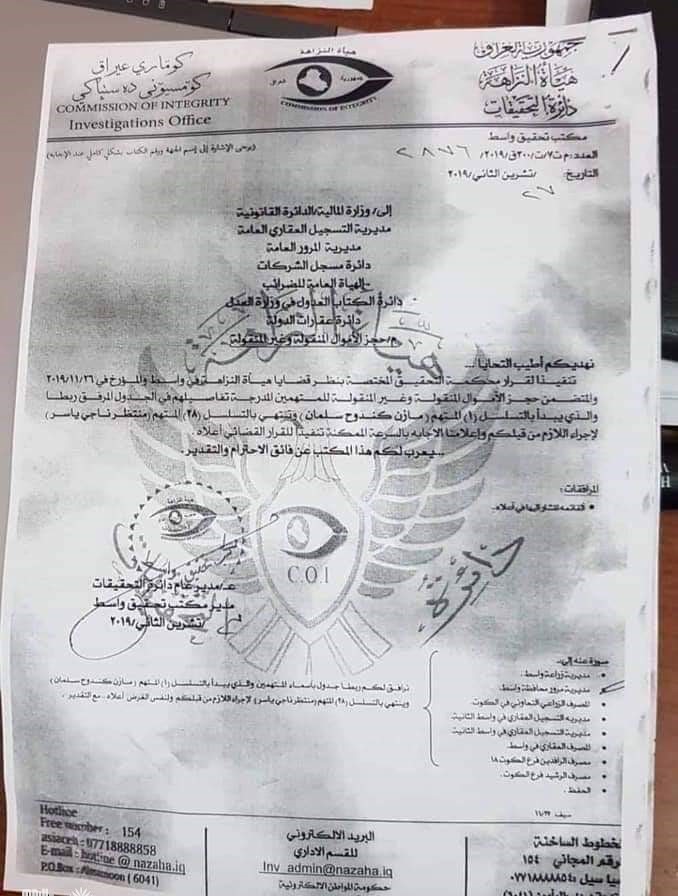 وذكرت وثيقة للنزاهة "تنفيذا لقرار محكمة التحقيق المختصة بنظر قضايا هيأة النزاهة في واسط والمؤرخ في 2019/11/26، والمتضمن حجز الأموال المنقولة وغير المنقولة للمتهمين المدرجة تفاصيلهم في الجدول المرفق ربطاً والذي يبدأ بالتسلسل (1) والمتهم (مازن كندوح سلمان) وتنتهي بالتسلسل (28) المتهم (منتظر ناجي ياسر) لإجراء اللازم من قبلكم وإعلامنا بالإجابة بالسرعة الممكنة تنفيذاً للقرار القضائي".
