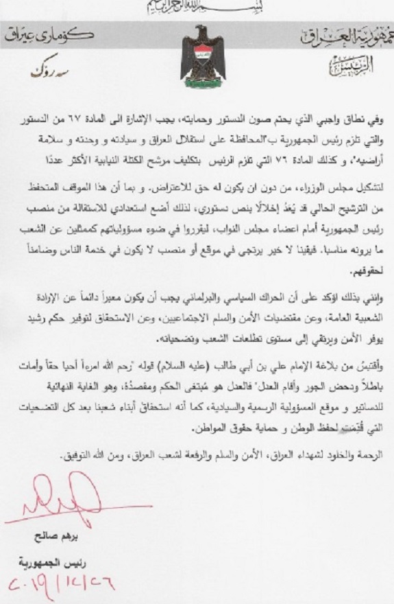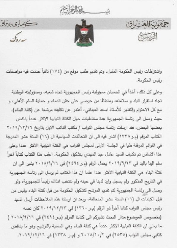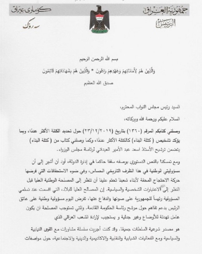 تنشر وكالة انباء براثا نص استقالة رئيس الجمهورية برهم صالح التي ارسلها الى البرلمان