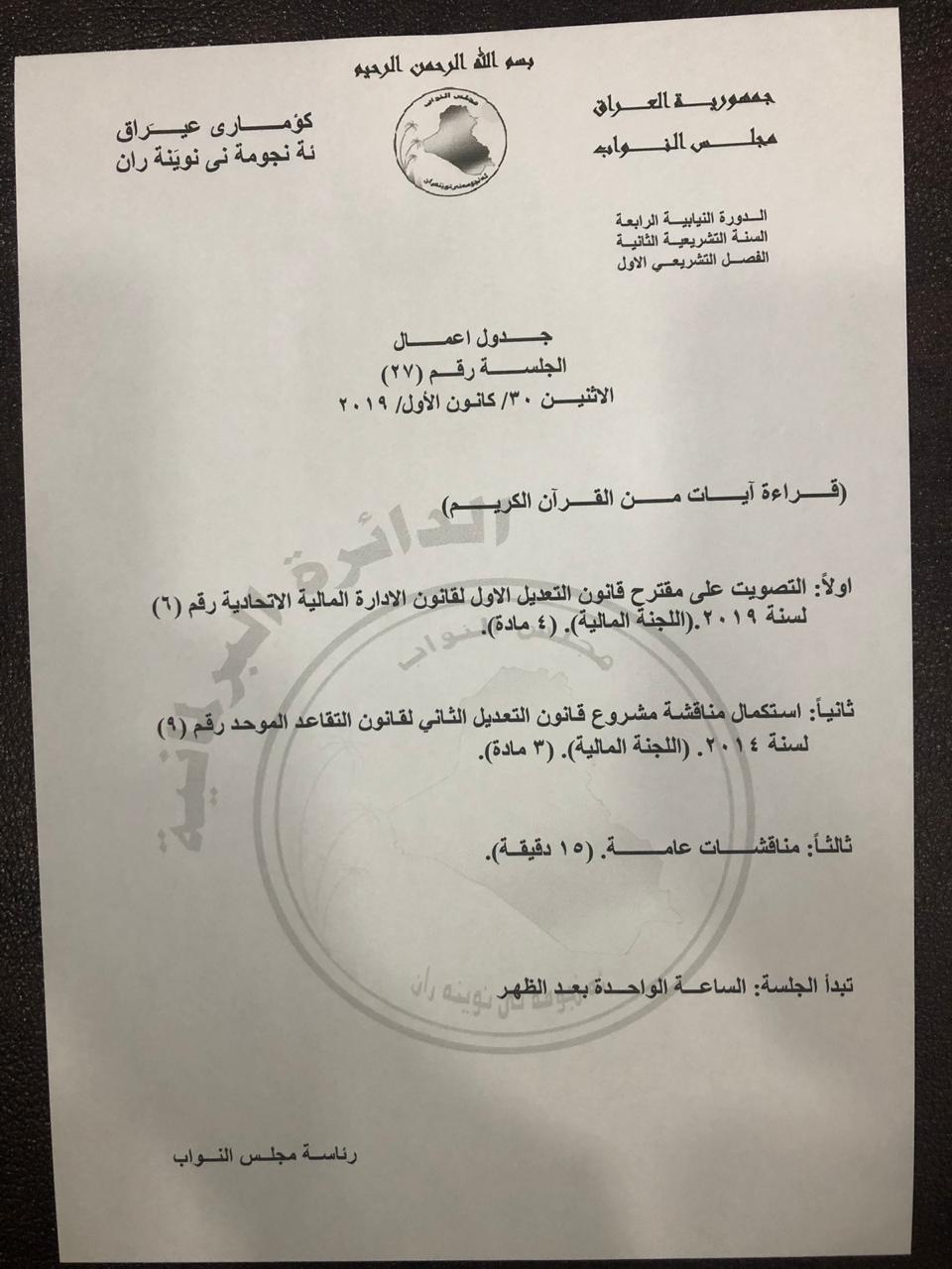 ويتضمن جدول أعمال جلسة الغد، التصويت على مقترح قانون التعديل الاول لقانون الادارة المالية الاتحادية رقم 6 لسنة 2019.