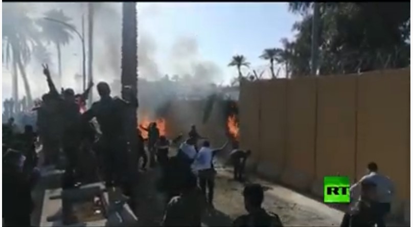 وقال المصدر ان "عدد من مشيعي شهداء الحشد الشعبي اضرموا النيران في جزء من السياج الخارجي للسفارة الاميركية في بغداد".