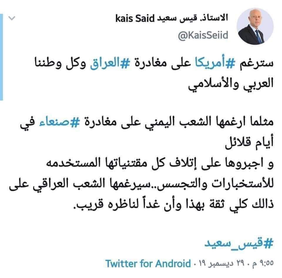 الرئيس التونسي يغرد من اجل العراق بعد اقتحام مشيعو الحشد الشعبي للسفارة الامريكية