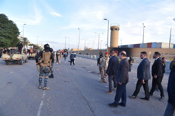 واقتحم المشيعون المنطقة الخضراء وتوجهوا إلى مبنى السفارة الاميركية وهم رافعين الأعلام العراقية وأعلام الحشد الشعبي، احتجاجاً على القصف الأميركي.