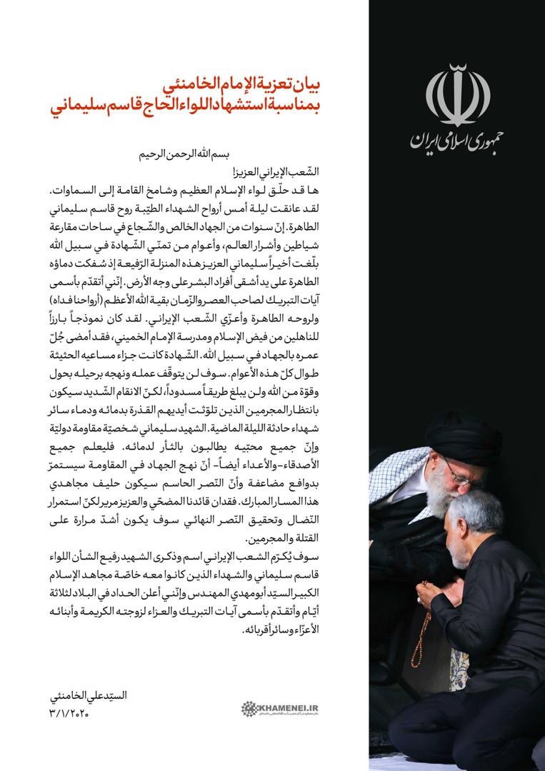 قائد الثورة الاسلامية في ايران اية الله العظمى السيد علي الخامنئي يصدر بيانا حول استشهاد القائد قاسم سليماني