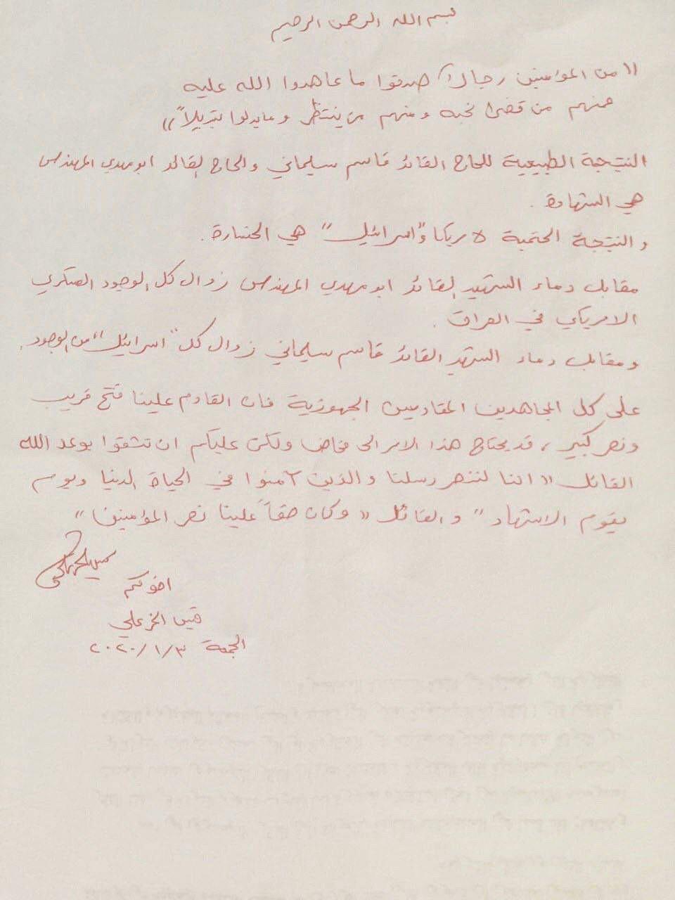 أكد زعيم حركة عصائب اهل الحق الشيخ قيس الخزعلي الجمعة، أن مقابل دماء المهندس وسليماني زوال الوجود الاميركي وكل اسرائيل، داعيا "المجاهدين المقاومين" الى الجهوزية.