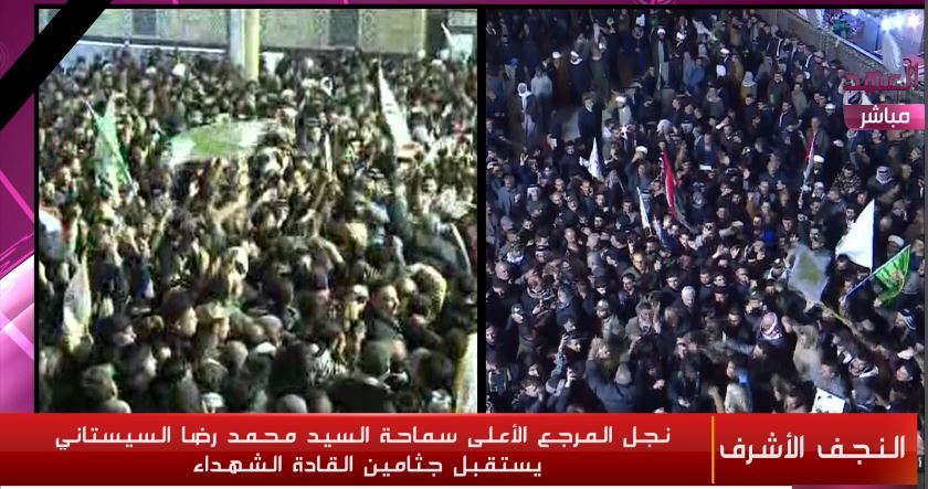 ردد اهالي محافظة النجف الاشرف، السبت، عبارات "كلا كلا امريكا" خلال استقابلهم جثامين نائب رئيس هيأة الحشد الشعبي ابو مهدي المهندس وقائد الحرس الثوري الايراني قاسم سليماني مع ثلة من الشهداء الذين طالهم القصف الامريكي قرب مطار بغداد الدولي أمس الجمعة.