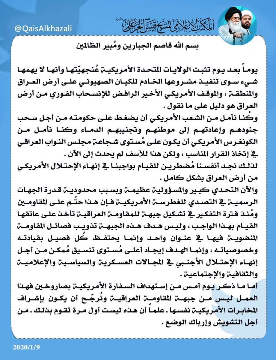 ونفى الشيخ الخزعلي نية "المقاومة العراقية" استهداف اي بعثة دبلوماسية، فيما اشار الى أن ساعة الصفر لعمليات الثأر لأبي مهدي المهنس لم تنطلق بعد، مجددا التهديد برد مزلزل.